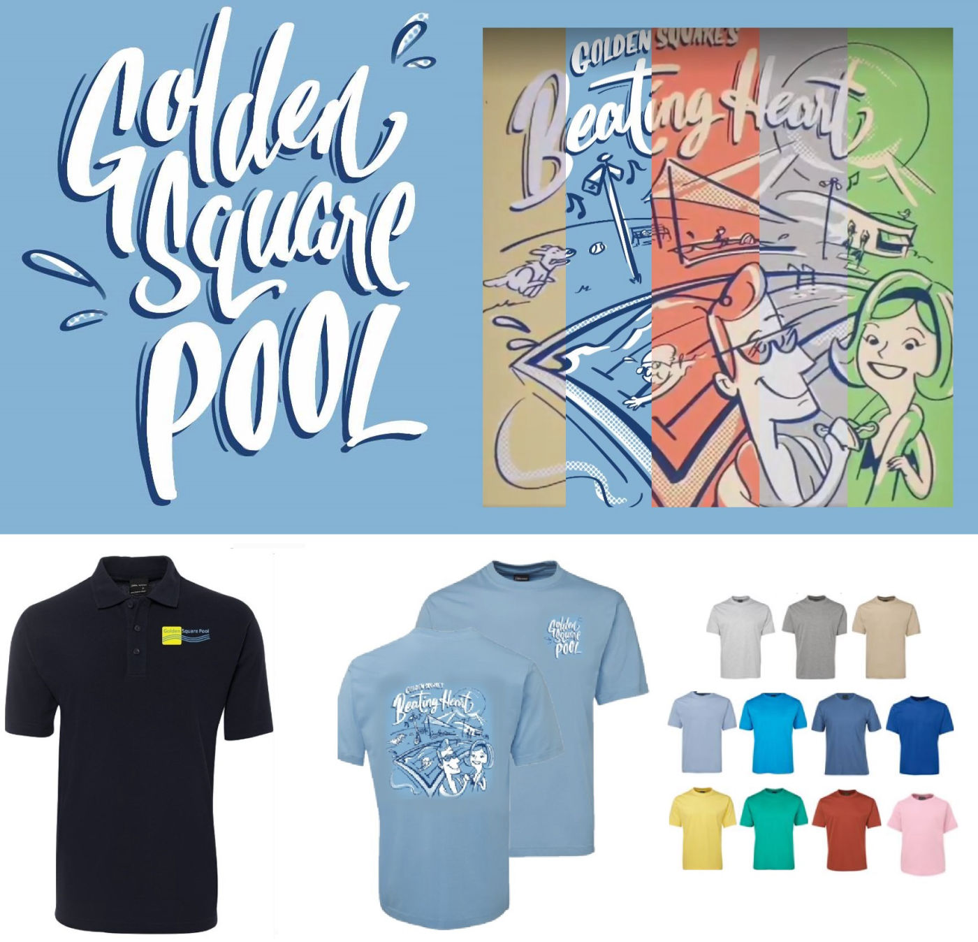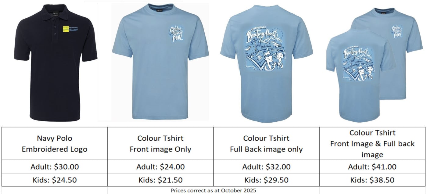 • T Shirts with the pool graphic can be ordered with choice of front or back designs in a range of colours.